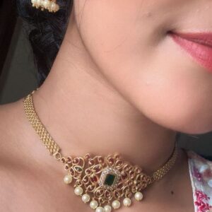 Elevate your ethnic elegance with this stunning Antique High Neck Choker, a timeless piece that reflects the richness of traditional Indian craftsmanship. Designed to sit gracefully high on the neck, this choker features intricate patterns and a classic antique gold finish that exudes vintage charm. Ideal for weddings, temple functions, and festive occasions, it pairs…