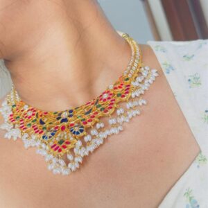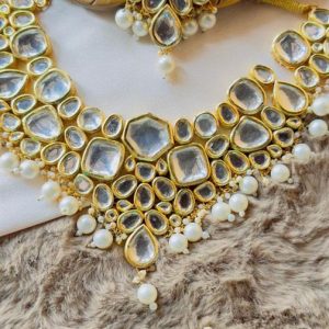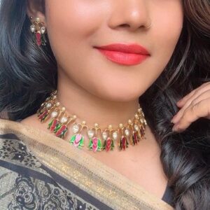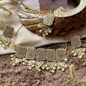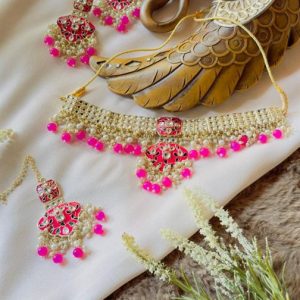 Elevate your elegance with this stunning Kundan choker set, featuring intricately crafted pieces that exude timeless charm. The choker showcases a captivating arrangement of sparkling Kundan stones, set in a delicate gold-tone base that beautifully complements traditional attire. Paired with matching earrings that dangle gracefully and a coordinating tikka that adds a touch of regal…