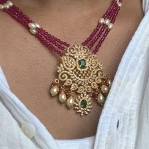 Enhance your traditional jewelry collection with our Green and Pink Ad Haram, featuring an exquisite Ad Stone Pendant. The vibrant combination of green and pink beads adds a lively touch, while the sparkling Ad stone pendant brings an element of luxury and charm. Perfect for weddings, festivals, and special occasions, this haram makes a bold statement, blending classic elegance with modern beauty. Crafted with high-quality materials, it offers both durability and timeless appeal. Shop now and embrace the fusion of color, elegance, and craftsmanship with this stunning Ad haram.