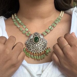 Discover timeless elegance with our Pearl Haram featuring a stunning Ad Stone Pendant. This exquisite piece combines the classic beauty of lustrous pearls with the dazzling brilliance of Ad stones, creating a sophisticated and regal look. Perfect for weddings, traditional ceremonies, or special occasions, this pearl haram adds a touch of grace and luxury to any outfit. The intricately designed Ad stone pendant enhances the necklace’s charm, making it a standout accessory in your jewelry collection. Shop now for a blend of tradition, opulence, and contemporary elegance with this unique pearl haram.