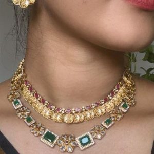 Invoke divine elegance with this Antique Lakshmi Necklace with Jhumkas, a timeless piece that celebrates traditional craftsmanship and spiritual grace. Featuring intricately carved Goddess Lakshmi motifs, this necklace is finished in a majestic antique gold tone, symbolizing prosperity, beauty, and heritage. The matching temple-style jhumkas add a touch of grandeur, making this set perfect for weddings, religious ceremonies, festivals, and traditional functions. Crafted with fine detailing and cultural essence, this Lakshmi necklace set beautifully complements sarees, silk blouses, and ethnic ensembles—making it a must-have for anyone who treasures the richness of temple jewelry.
